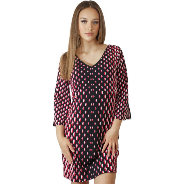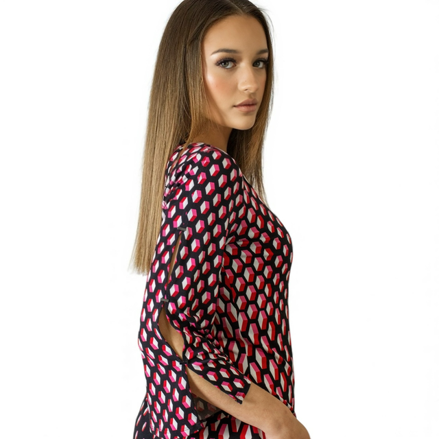 Vestido original White House Black Market, con un llamativo estampado de rombos en tonos negro, rojizo y blanco, que crea un contraste elegante y muy estilizador. Su diseño moderno combina perfectamente color, geometría y un calce favorecedor en talla S, ideal para resaltar la figura de manera sofisticada.